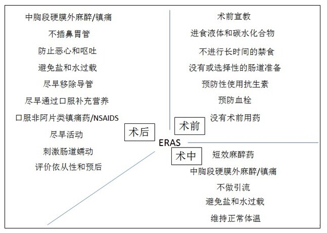 ERAS流程是由EARA學(xué)會(huì)推出的以證據(jù)為基礎(chǔ)的監(jiān)護(hù)方案,已有證據(jù)表明,這些監(jiān)護(hù)原則對(duì)護(hù)理時(shí)間和術(shù)后并發(fā)癥有很大的影響。下圖為ERAS流程的主要組成部分:
